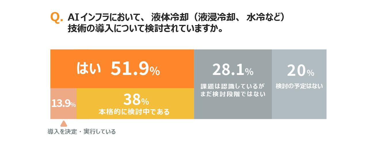 こうした背景から、液体冷却技術への関心も高まっています。液体冷却技術の導入状況について、「導入を決定・実行している」(13.9%)、「本格的に検討中」(38.1%)と、半数以上の企業が導入、または導入を検討していることが明らかになりました。