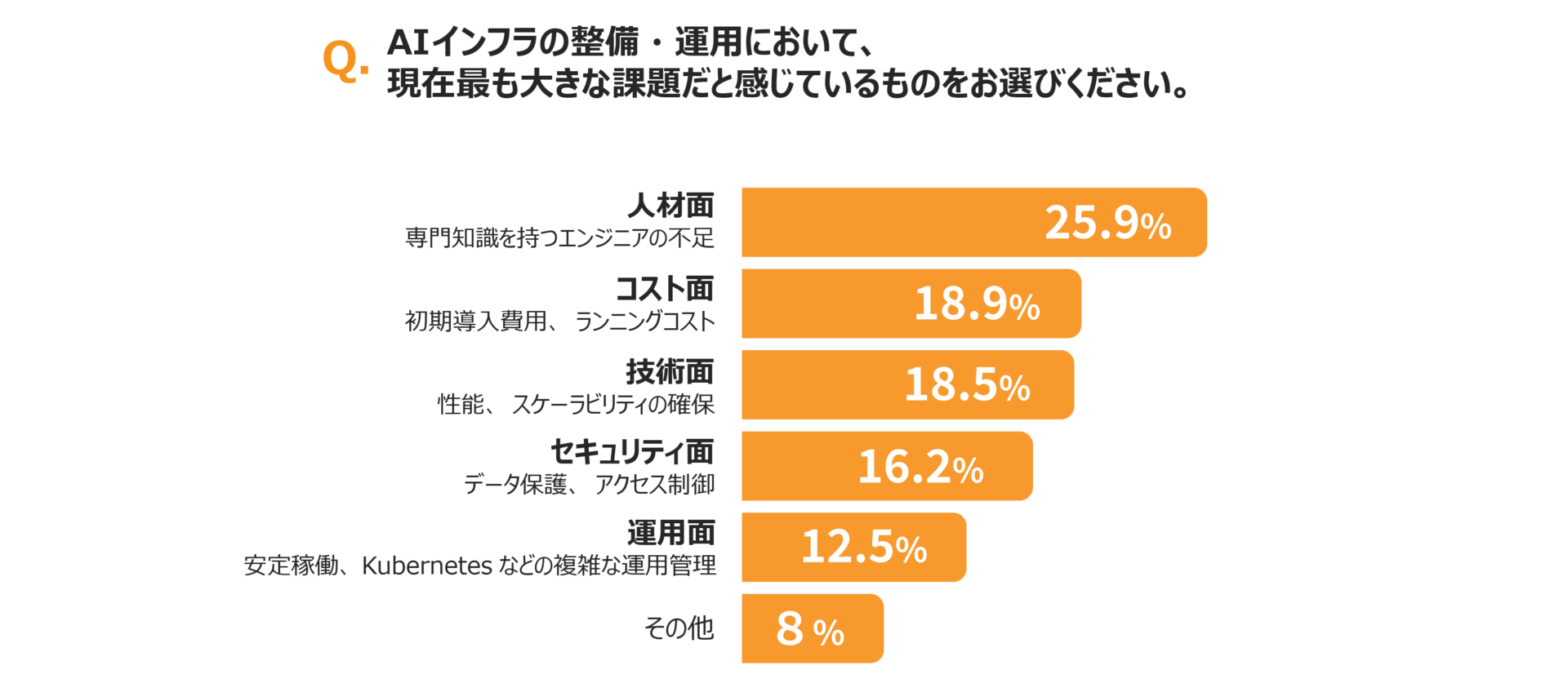 - AIインフラ導入・運用における課題は、多層的。中でも1位は「人材面」(25.9%)、2位「コスト面」(18.9%)、3位「技術面」(18.5%)、4位「セキュリティ面」(16.2%)と続く。