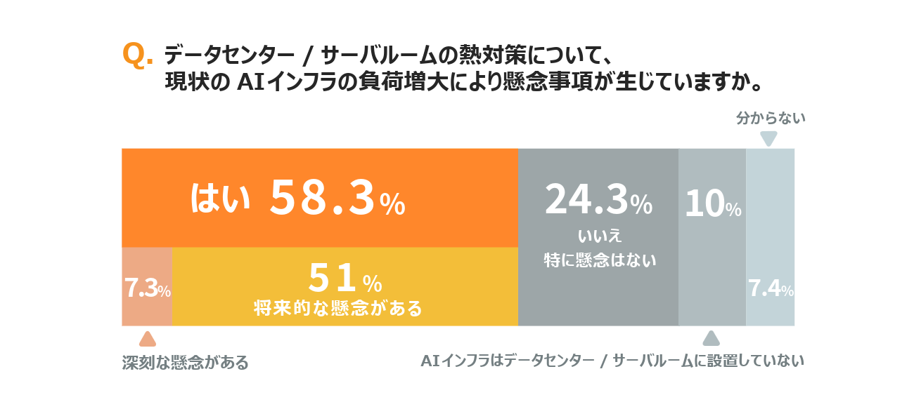 データセンターやサーバルームの熱対策については、「深刻な課題となっている」「将来的な懸念がある」と回答した企業の合計が58.3%に達し、約6割の企業が発熱対策を課題として認識していることが分かりました。