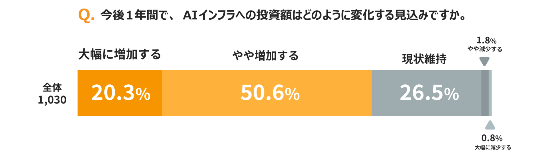 今後1年間のAIインフラ投資について、「大幅に増加する」、「やや増加する」と回答した企業は70.9%に達し、約7割の企業が投資拡大を見込んでいることが分かりました。