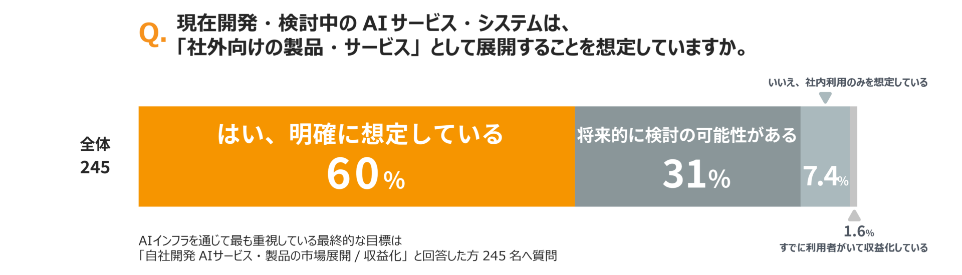 この結果から、AIインフラは単なるIT基盤ではなく、企業のAI活用戦略を支える重要な経営投資として位置づけられつつあることがうかがえます。実際に、AIを活用したシステムについて、「社外向けの製品・サービスとして明確に想定している」と回答した企業は60.0%に達しました。