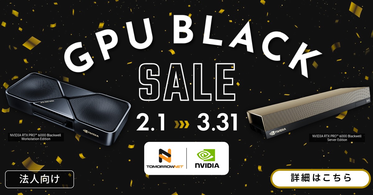 1月31日までの期間限定としていたキャンペーン、『NVIDIA GPU Blackセール』ですが、AI需要の高まりによる価格高騰を受けまして、2026年3月31日まで開催期間を延長いたします!今が最安値となりますので、この機会にぜひお問い合わせください!