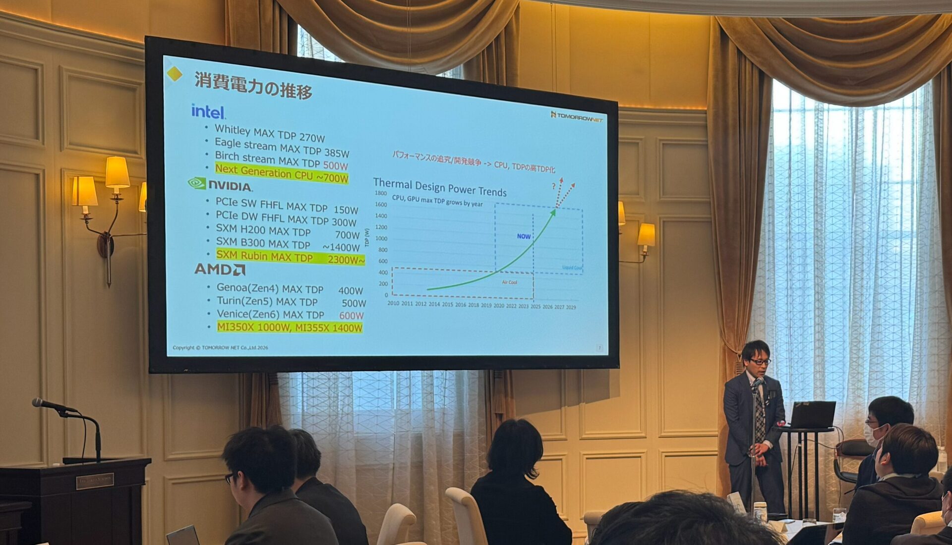 最初のセッションでは、次世代GPUの登場に伴う「高TDP(熱設計電力)化」への対策が語られました。1枚で1000W〜2000Wを超えるデバイスが登場する中、従来の空冷方式は限界を迎えつつあります。