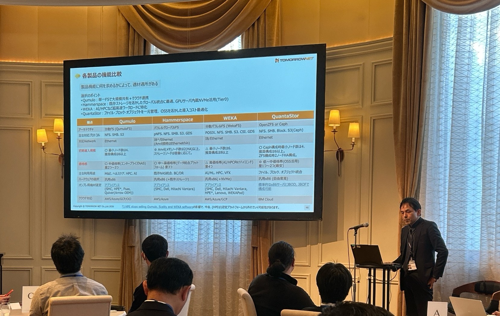 QumuloやHammerspaceによるデータの可視化・ハイブリッドクラウド連携、WEKAによる超高速ワークロード対応、そしてQuantaStorによる統合管理など、用途に合わせてこれらを「適材適所」で組み合わせる設計指針が示されました。