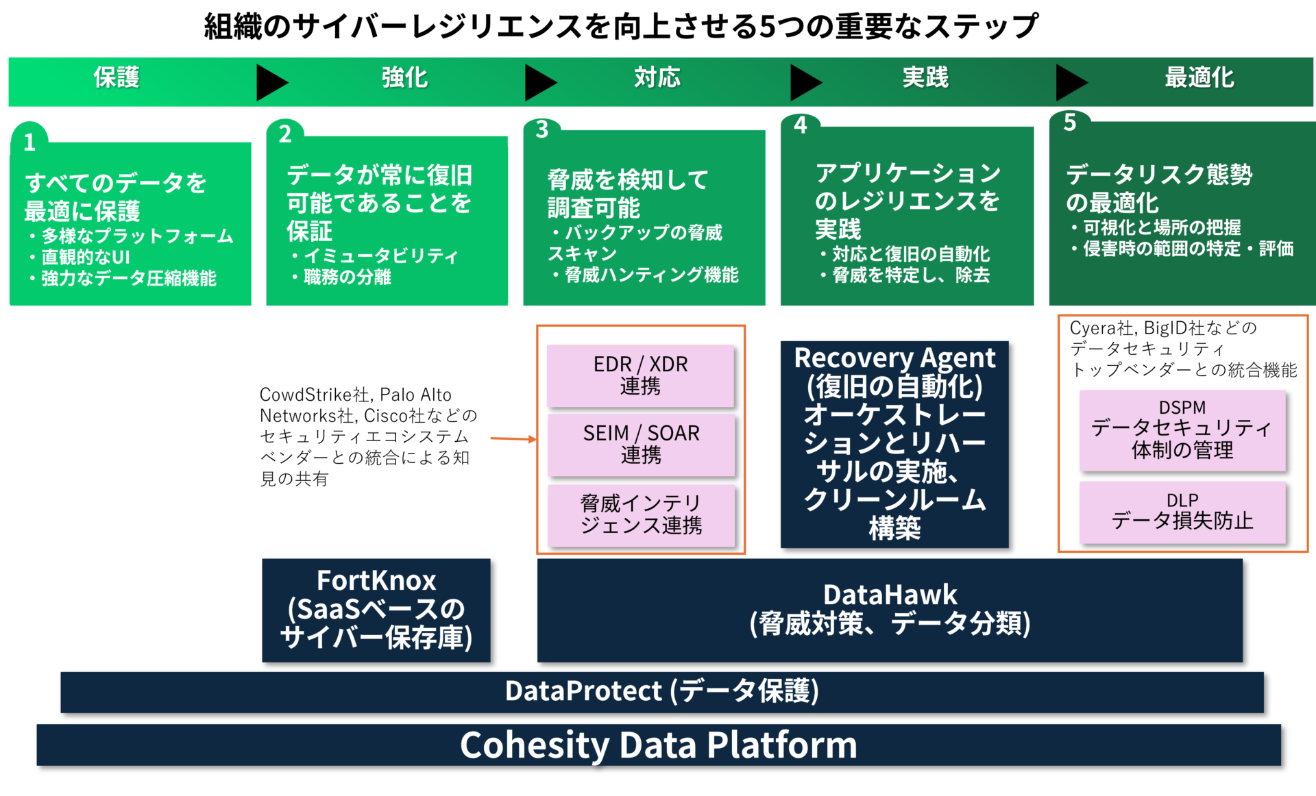 悪意のあるインシデント(サイバー攻撃)に対し、セキュリティの安全性を確保しながらデータを迅速に復旧するための能力です。Cohesity Data Cloudは、保護から最適化までの5つの成熟度ステップでサイバーレジリエンス強化を支援します。