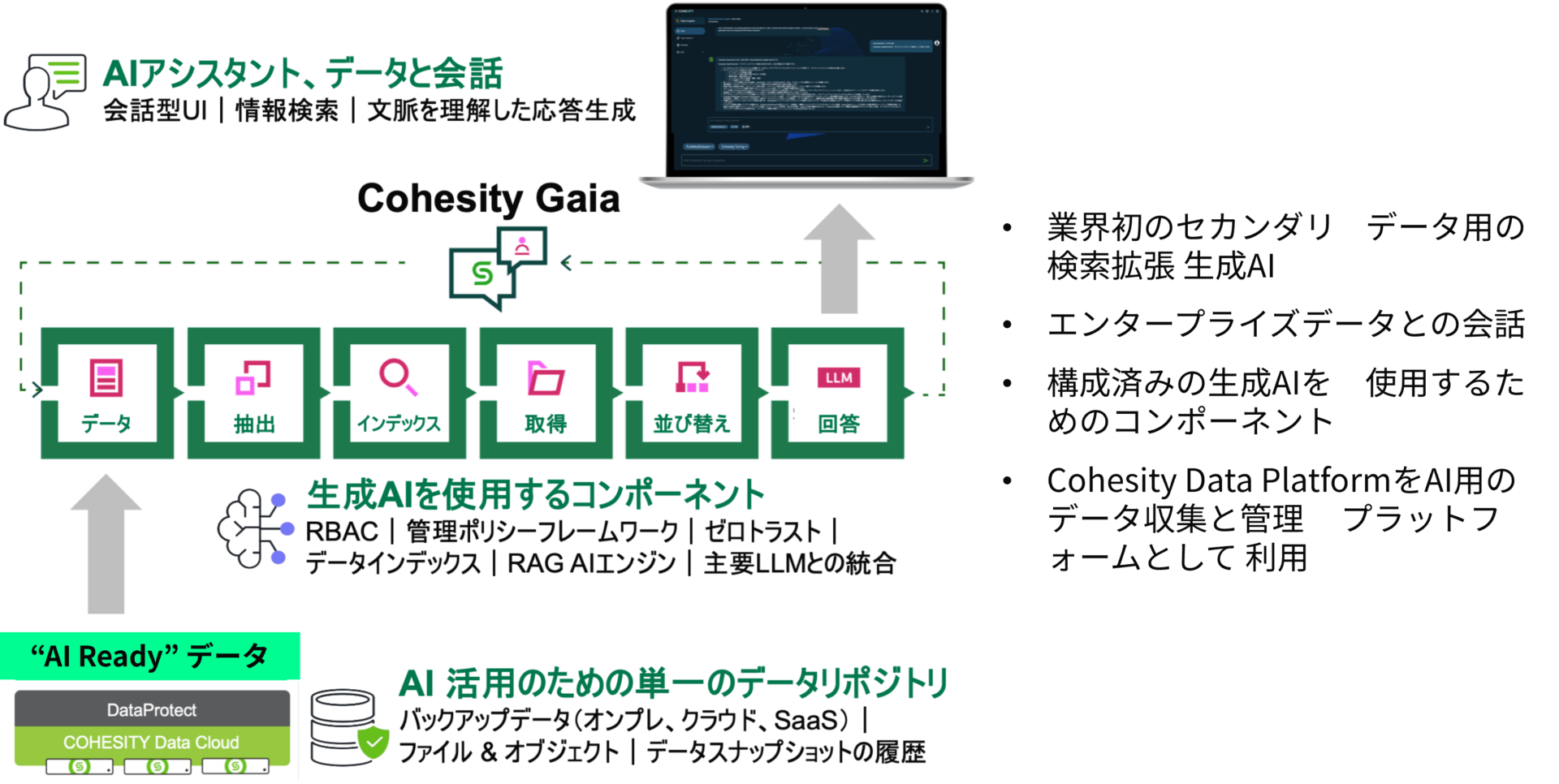 Cohesity Gaiaは、セカンダリデータ用の検索拡張生成AI (RAG)を業界で初めて提供します。これにより、バックアップデータから迅速にインサイトを引き出すことが可能です。