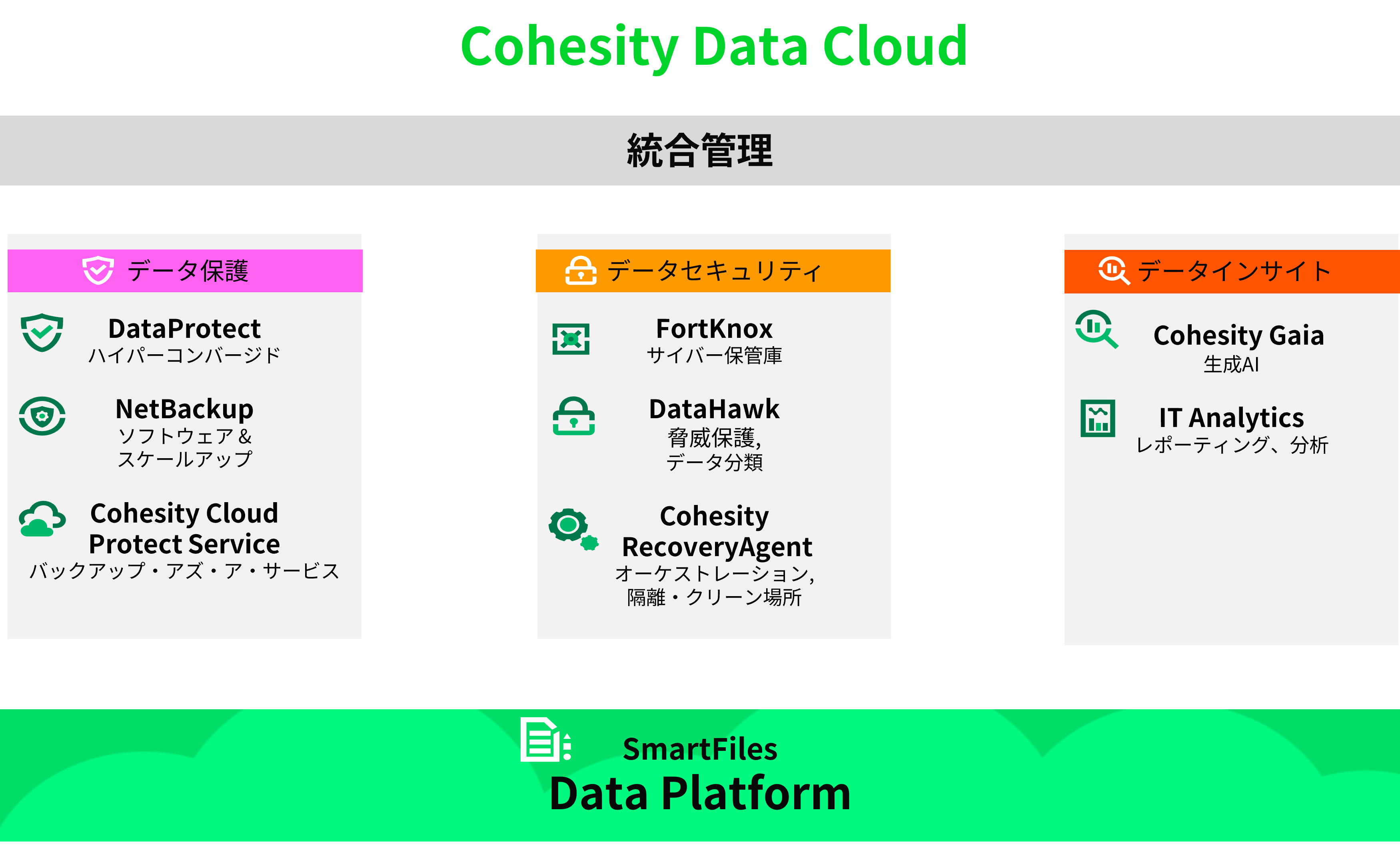 Cohesity Data Cloud は、データ保護・セキュリティ・データインサイトを統合した次世代プラットフォームです。