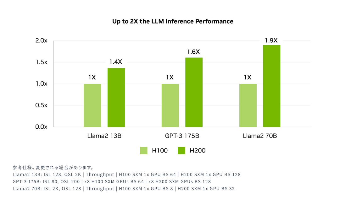 NVIDIA H200は、Llama 2のようなLLMを処理する際、従来のH100 GPUと比較して推論速度を最大2倍に向上させ、企業がより迅速に洞察を得られるよう支援します。