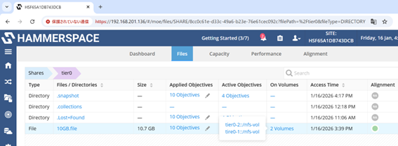 HS Web InterfaceでHS Share=tier0のFilesを確認すると、10GB.fileのOn Volumes(ファイル保存場所)が2Volumes(GPUサーバーのRAIDデバイス x2)になっていることが確認できます。