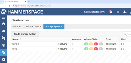 ② 「Infrastructure」-「Storage Systems」メニューで「Add Storage System」をクリックし、GPUサーバ x2をAnvilに登録します。(登録する際に「Name」はtier0-1およびtier0-2、「Storage Type」はNAS Storage、「Type」はOther NFSを選択します。)