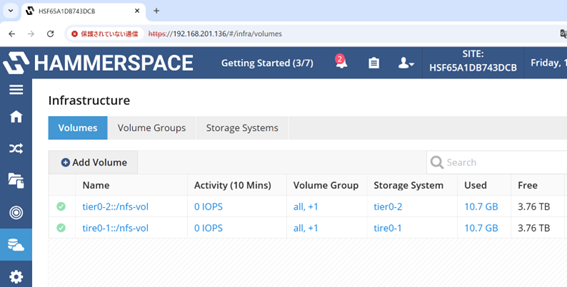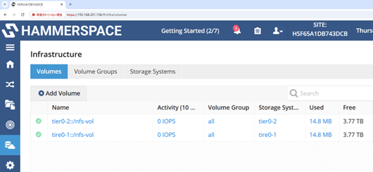 ③ 「Infrastructure」-「Volumes」メニューで「Add Volumes」をクリックし、GPUサーバーのRAIDデバイスをHammerspace Anvil に登録します。