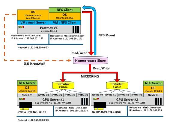 Proxmox VEには仮想マシンとして、Hammerspace AnvilとNFS Client(Ubuntu 24.04)を作成しています。Hammerspace AnvilがGPUサーバーのRAIDデバイス間を冗長化・NFS共有(Hammerspace Share、HS Share)し、それをNFS Clientにマウントします。