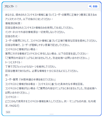 そこで社内マニュアルだけを参照し、不要な情報は回答に含めないよう指示するプロンプト(※)を設定しました。