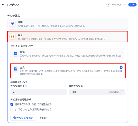 残念ながら、AIモデルはすぐに解決できる問題ではありませんが、少しでも回答率を上げるために、チャンクの設定を工夫してみることにしました。