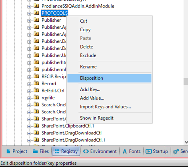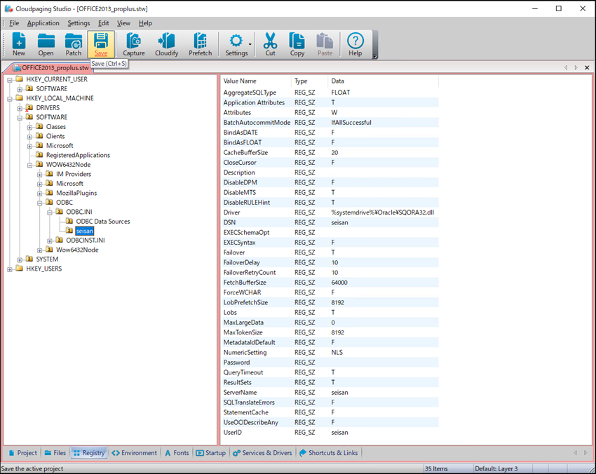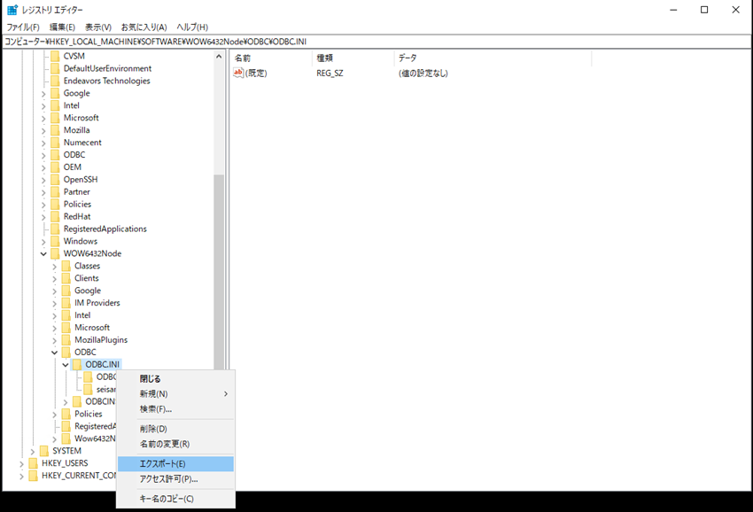 システムDSNの設定を仮想化パッケージに追加するため、レジストリから上記で設定した内容の項目をエクスポートします。
