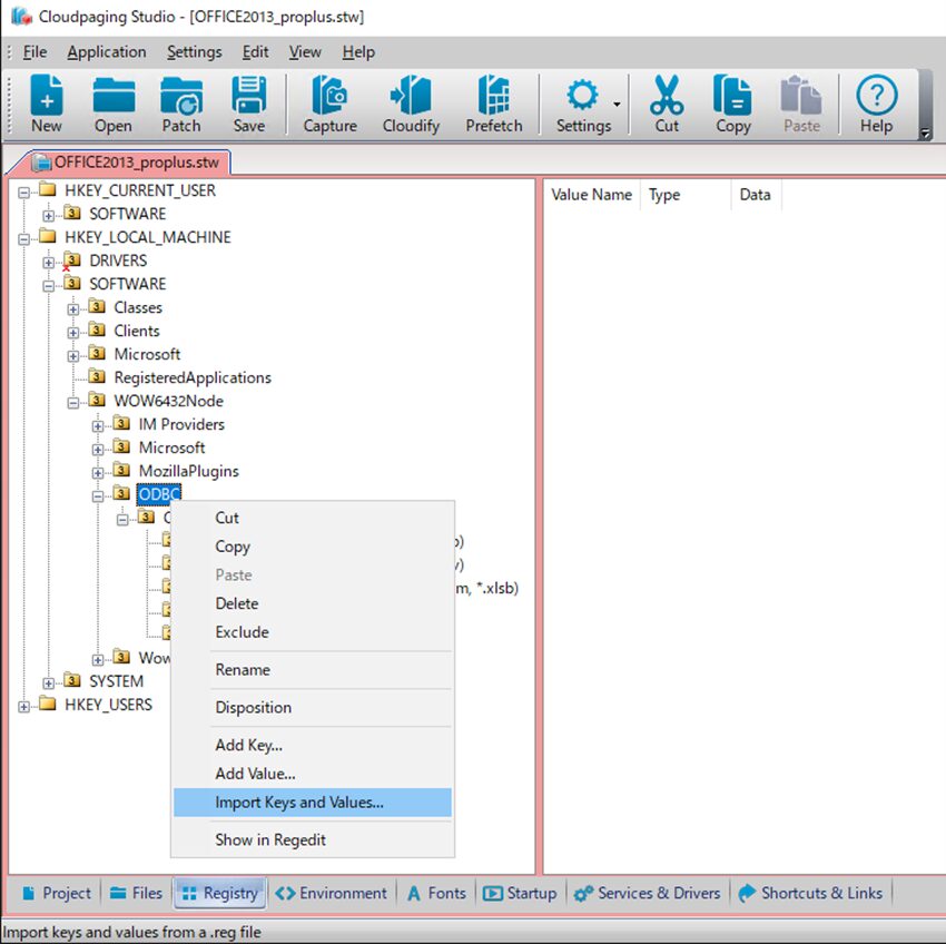上記でエクスポートしたレジストリ設定のregファイルを選択し、Cloudpaging studioのRegistryタブでインポートを実施します。