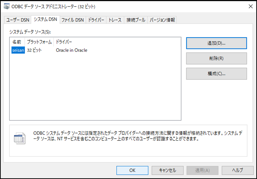 その後に、ローカルPCのODBCデータソースアドミニストレーター(32ビット)を開き、Oracle ODBCドライバを利用したシステムDSNを追加します。
