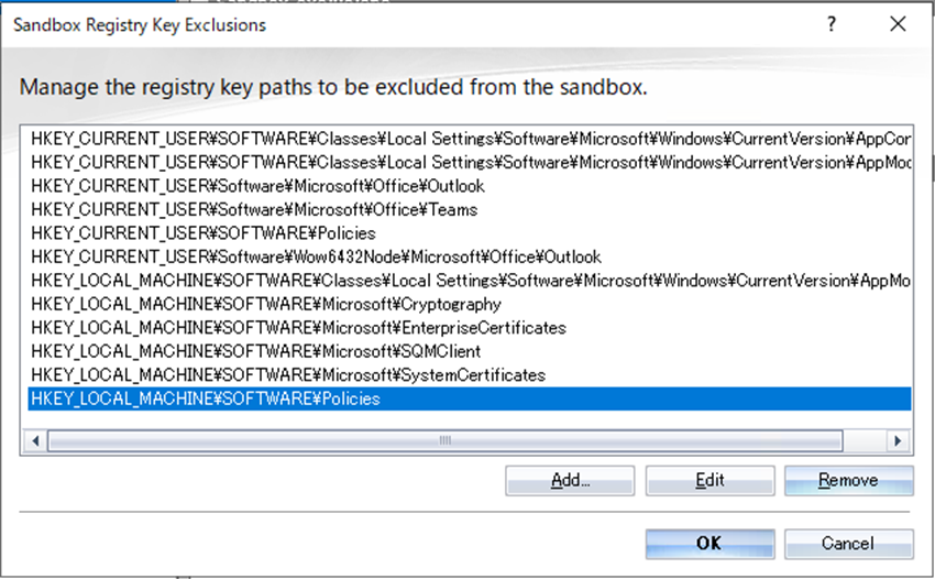 ⑪ SandBox内で除外されるレジストリを指定します。