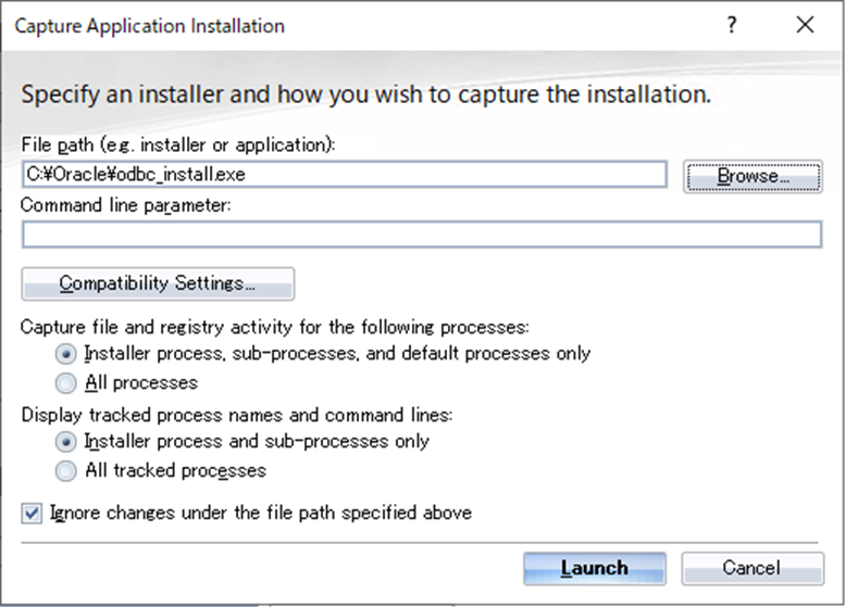 Captureアイコンをクリックし、odbc_install.exeを選択しOracle ODBCドライバのインストールをキャプチャします。
