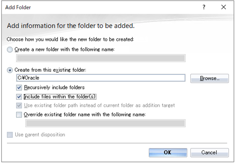 Cloudpaging studioのFilesタブで、を選択しsubfolderとしてC:\Oracle\networkのフォルダとサブフォルダ・ファイルをすべて追加します。