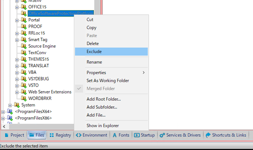Cloudpaging studioのFilesタブとRegistryタブで、対象の項目を選択し除外設定を行います。(インストールをキャプチャする際に既に除外設定されている項目もあります。)