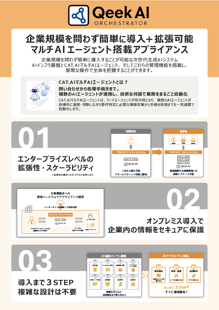 企業規模を問わず簡単に導入することが可能な次世代生成AIシステム「QeekAI」、AIインフラ基盤とCAT.AIマルチAIエージェント、そしてこれらの管理機能を搭載し、簡易な操作で全体を把握することができます。